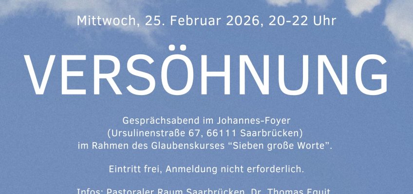Der Abend zum Thema „Versöhnung“ findet am Mittwoch, 25. Februar 2026, um 20 Uhr im Johannes-Foyer statt (Ursulinenstraße 67, 66111 Saarbrücken). Er findet in der Reihe „Sieben große Worte – Ein Glaubenskurs für Erwachsene“ statt, bei der bis zum Sommer jeden Monat zentrale religiöse Themen beleuchtet werden. Der Eintritt ist frei, eine Anmeldung nicht erforderlich.