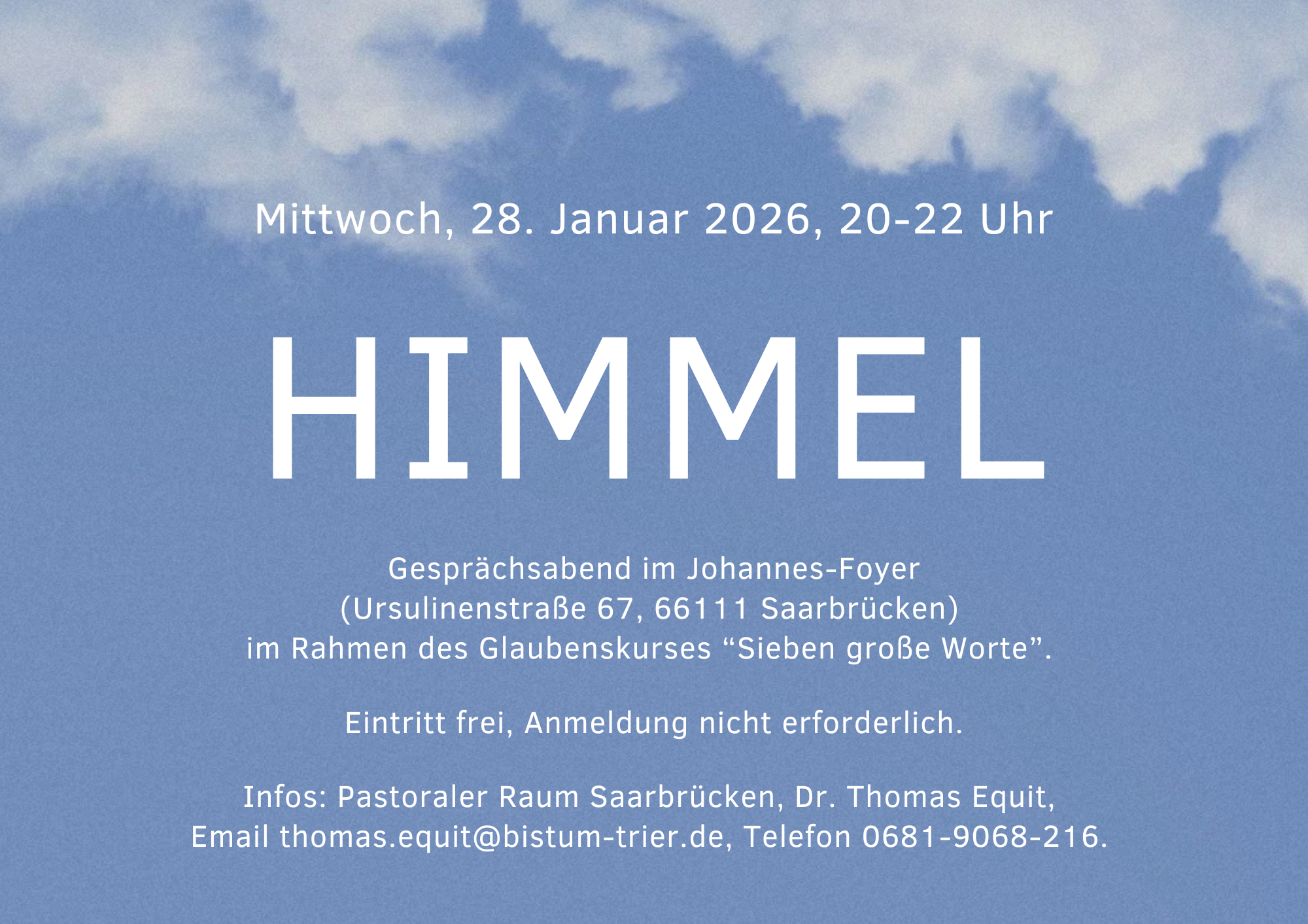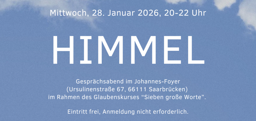 Bei einem Gesprächsabend zum Thema „Himmel“ Ende Januar in Saarbrücken geht es um diese und um ähnliche Fragen. Mit dieser Veranstaltung startet die katholische Kirche einen Glaubenskurs für Erwachsene, bei dem unter dem Titel „Sieben große Worte“ Monat für Monat zentrale Themen aus der christlichen Tradition in Impulsvorträgen erklärt, durch Beispiele veranschaulicht und durch Gespräche in Gruppen vertieft werden.