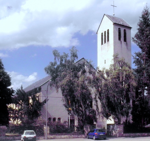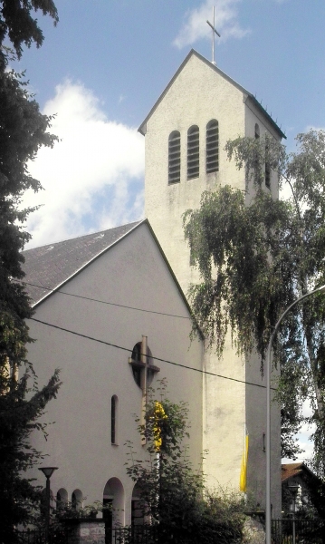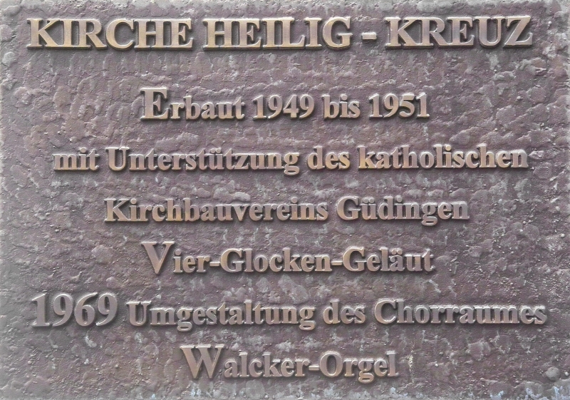 Die Kirche Heilig Kreuz, Güdingen, wurde in den 30er Jahren des 20. Jahrhunderts im Bauhausstil vom Architekten Guggelsberger geplant, konnte aber in den politisch schwierigen Zeiten nicht gebaut werden. Nach dem zweiten Weltkrieg wurde sie dann 1949-51 anhand der alten Pläne gebaut. Die Architektur der Kirche beeindruckt durch ihre Schlichtheit und Geradlinigkeit.