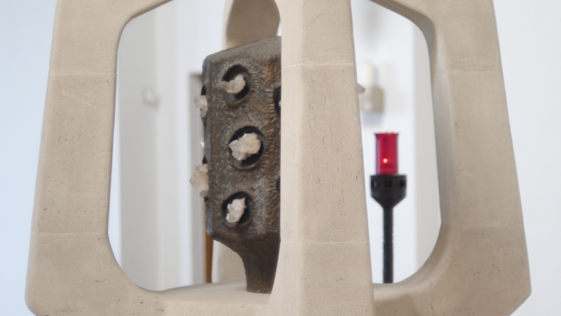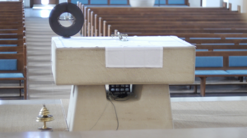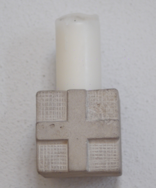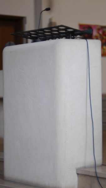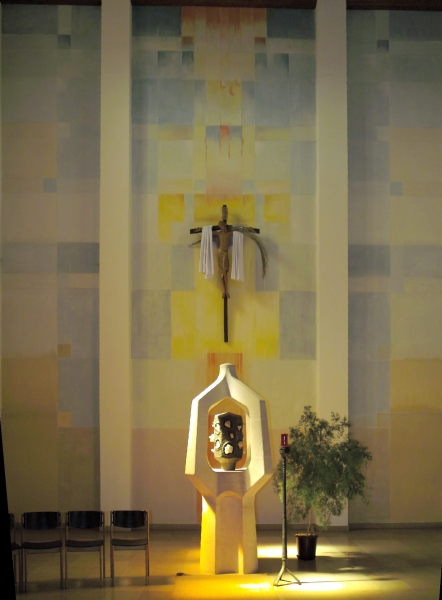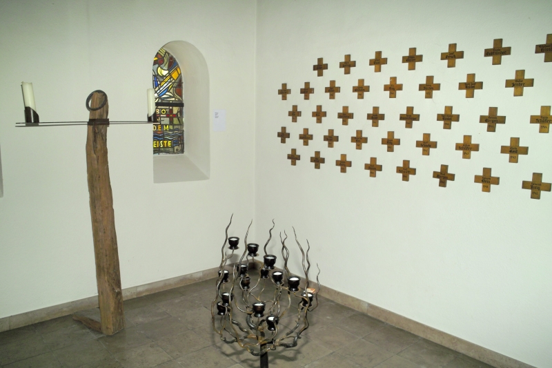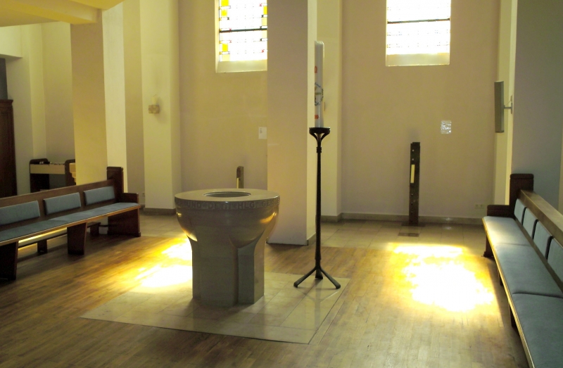 Im hinteren Teil der Kirche ist das Taufbecken mit Platz genug für Taufgottesdienste und die Gedächtniskapelle mit Kreuzen für die in den Kriegen gefallenen katholischen Güdinger.