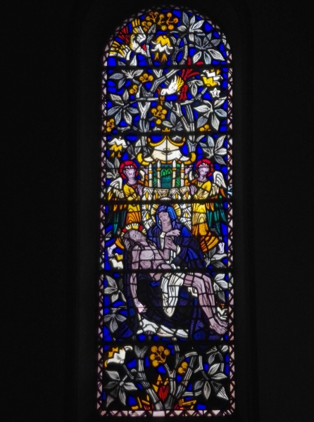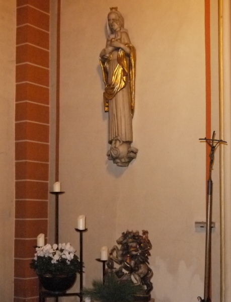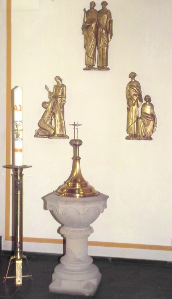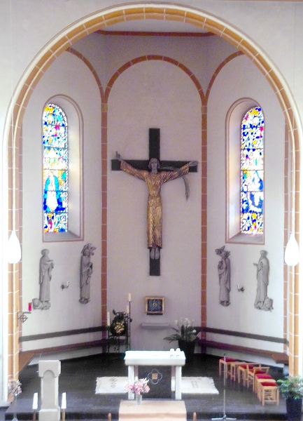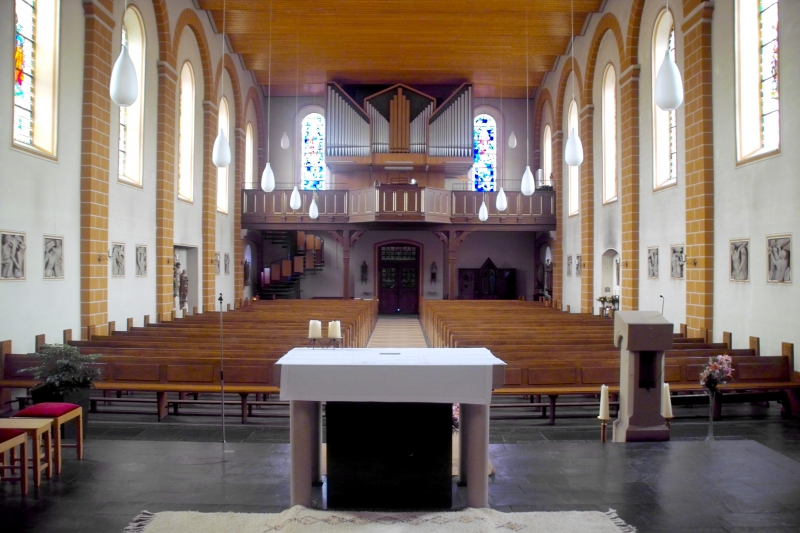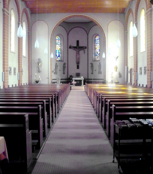 2012 wurde sie außen restauriert und die letzen Kriegsschäden beseitigt. Das Innere wird dominiert durch das überdimensionale Kreuz von Professor Emil Sutor (Karslruhe) vom Ende der vierziger Jahre. Er gestaltete auch den Kreuzweg und die Skulpturen der vier Evangelisten, die das Kreuz flankieren.