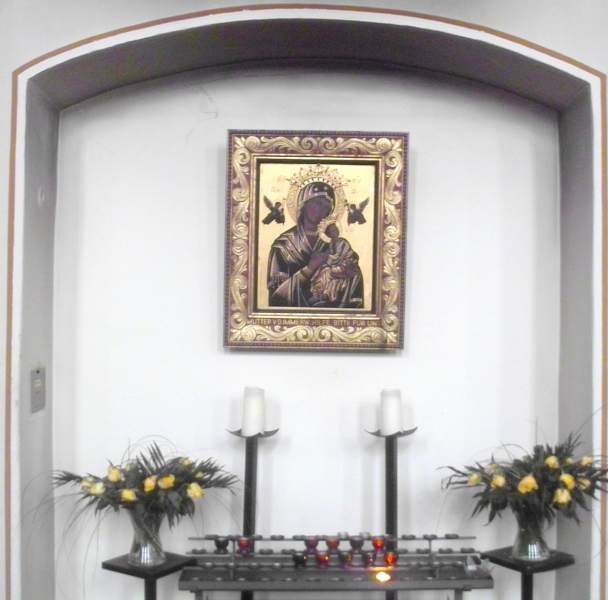 Dir Fotos zeigen die Kirche von außen, den Innenraum, das Kreuz und die Marienbilder im Altarraum, das Taufbecken, das namengebende Bild von der immerwährenden Hilfe und die Granate, die im zweiten Weltkrieg in den Chorraum einschlug.
